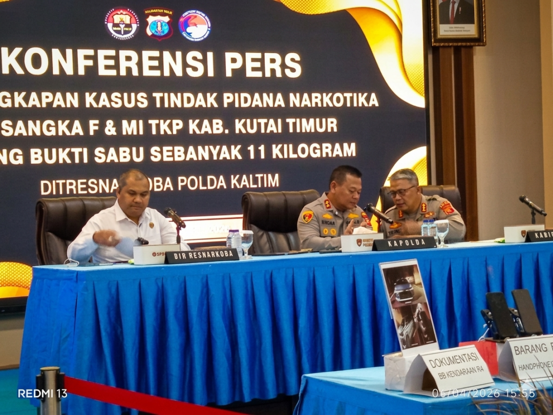 BALIKPAPAN, Kaltimku.id –– Komitmen tanpa kompromi dalam memerangi peredaran gelap narkotika kembali dibuktikan jajaran Kepolisian Daerah Kalimantan Timur (Polda Kaltim). Dalam konferensi pers di Gedung Mahakam Polda Kaltim pada Senin (6/4/2026), Polda Kaltim merilis pengungkapan kasus besar tindak pidana narkoba dengan barang bukti sabu seberat 11 kilogram.