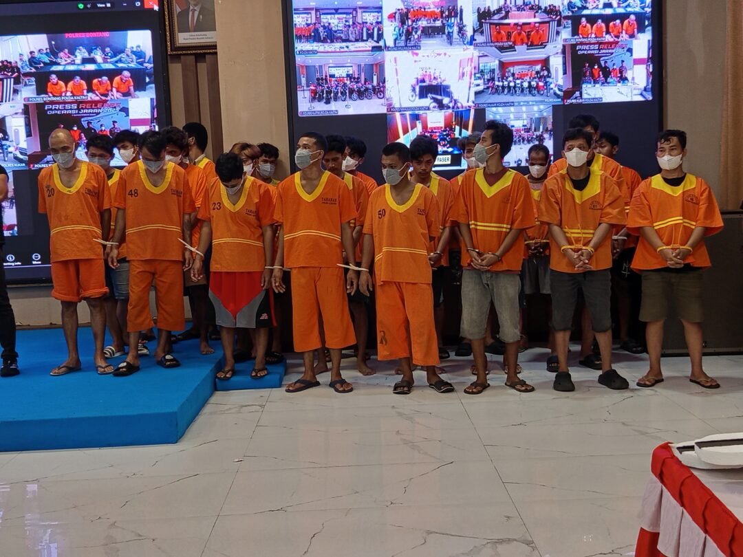 Balikpapan, KALTIMKU.ID – Puluhan tersangka pencurian kendaraan bermotor (curanmor) yang sudah mengenakan baju warna oranye hanya bisa menunduk saat dihadirkan di hadapan awak media, di ruang Mahakam Polda (Kepolisian Daerah) Kaltim, Kota Balikpapan, Jumat (7/11/2025).